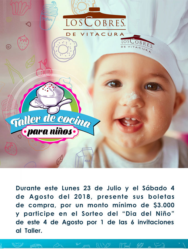 Durante este lunes 23 de Julio y el sábado 4 de Agosto del 2018,  presente sus boletas de compra,  por un monto mínimo de $3.000 y participe en el sorteo del “Día del Niño” de este 4 de Agosto por 1 de las 6 invitaciones al taller.